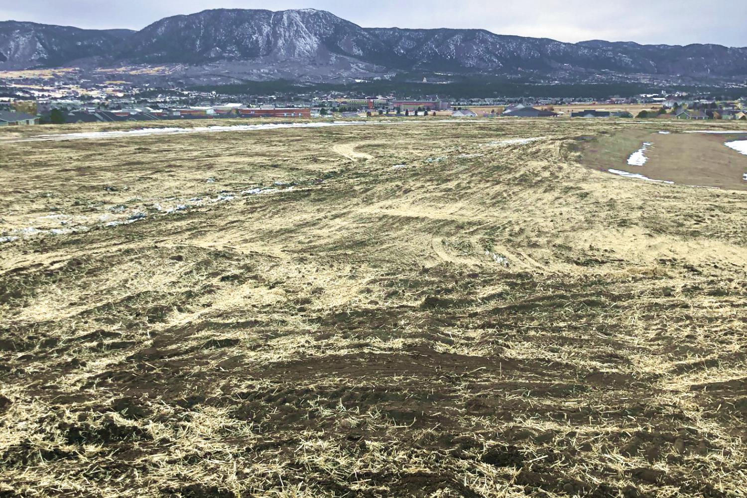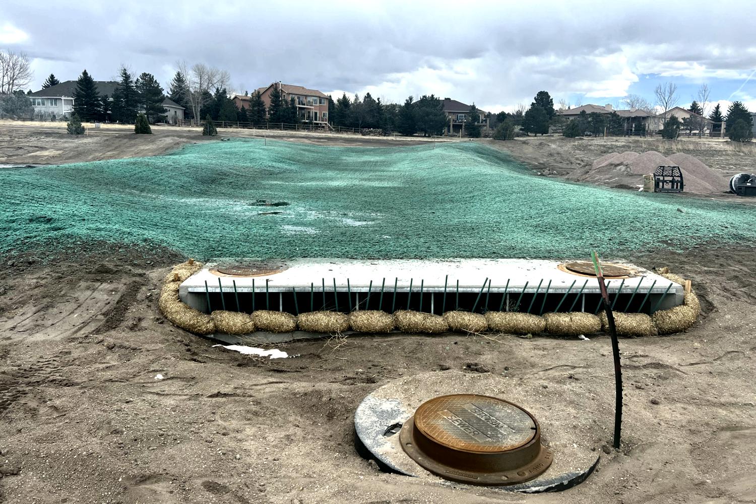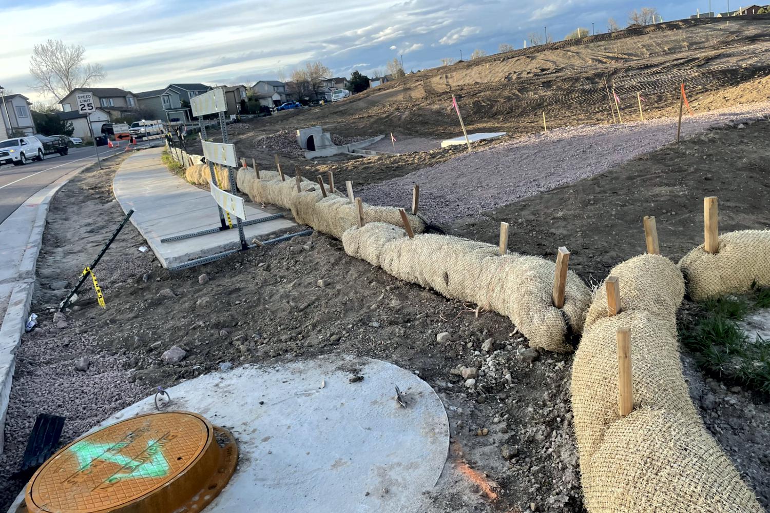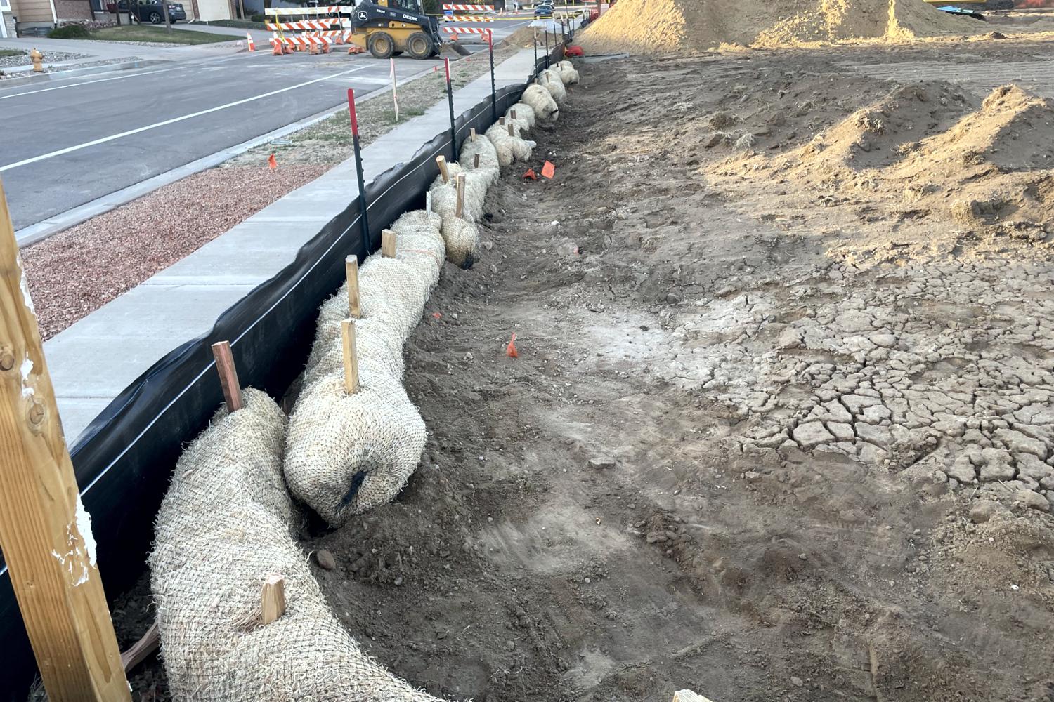 Erosion control in Colorado Springs. Erosion control in Colorado Springs, installed erosion control blankets to keep the seed bedded down, keep the dirt from moving in a rain storm and help the grass seed to germinate. The straw waddles were installed to prevent the dirt from up stream moving down onto the erosion blanket